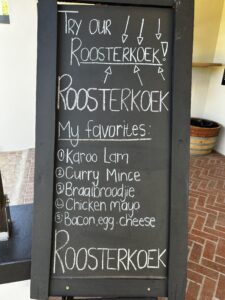 The roosterkoek was fresh and light with generous toppings. The Karoo lamb was mouth- watering and Michael’s bacon and egg was done to perfection. We ate slowly enjoying both the food and the views and believe me you will never leave Banhoek Farmstall hungry, but unfortunately for the dogs no lamb or bacon fell off the table.