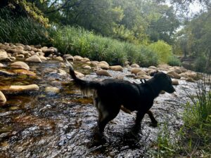 following the trail along the river. The trail is 75% in the shade with multiple spots where the dogs could take a dip in the river. Please note that the trail does get used by runners and cyclists, however because it was such a hot day we only saw 1 runner and 1 cyclist. When we cut down the river we let the dogs off the lead for a while for a splash and a drink, the water was a bit shallow for a real swimming.
